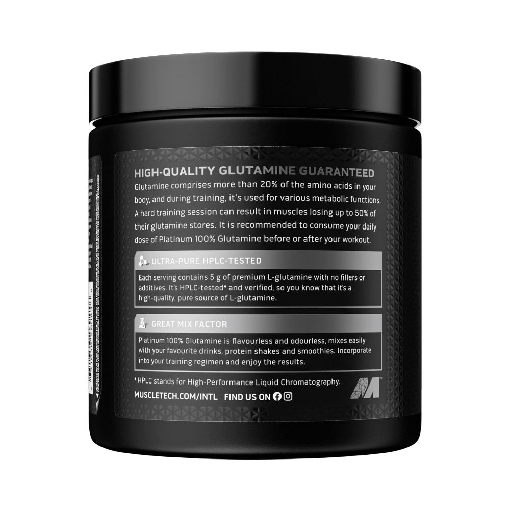 MuscleTech Platinum Glutamine 300 g is a pure amino acid supplement formulated to provide 100 % L-Glutamine in one convenient serving. Each scoop supplies a defined dose of this naturally occurring amino acid in an unflavoured, versatile powder format suitable for individuals with active lifestyles. The formulation contains no colourants, sweeteners or added ingredients.