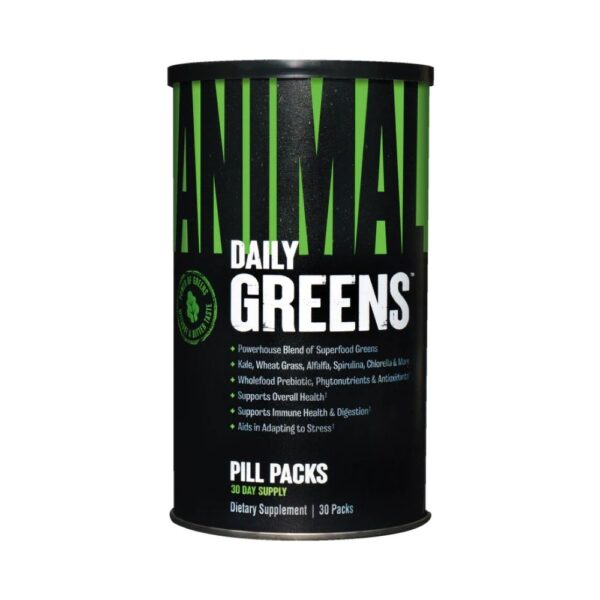 Animal Greens Pak is a comprehensive multi-nutrient supplement formulated to provide a wide range of vitamins, minerals, whole-food greens, plant extracts and other nutritional ingredients in one convenient daily serving. Each pack combines multiple nutrient groups in a balanced format suitable for individuals with active lifestyles. The formula includes a blend of greens such as wheat grass, spirulina, chlorella, alfalfa and kale, plus phytonutrient complexes, pre-biotic and digestive enzyme blends, and other supporting compounds that contribute to the overall nutrient intake within a varied and balanced diet.